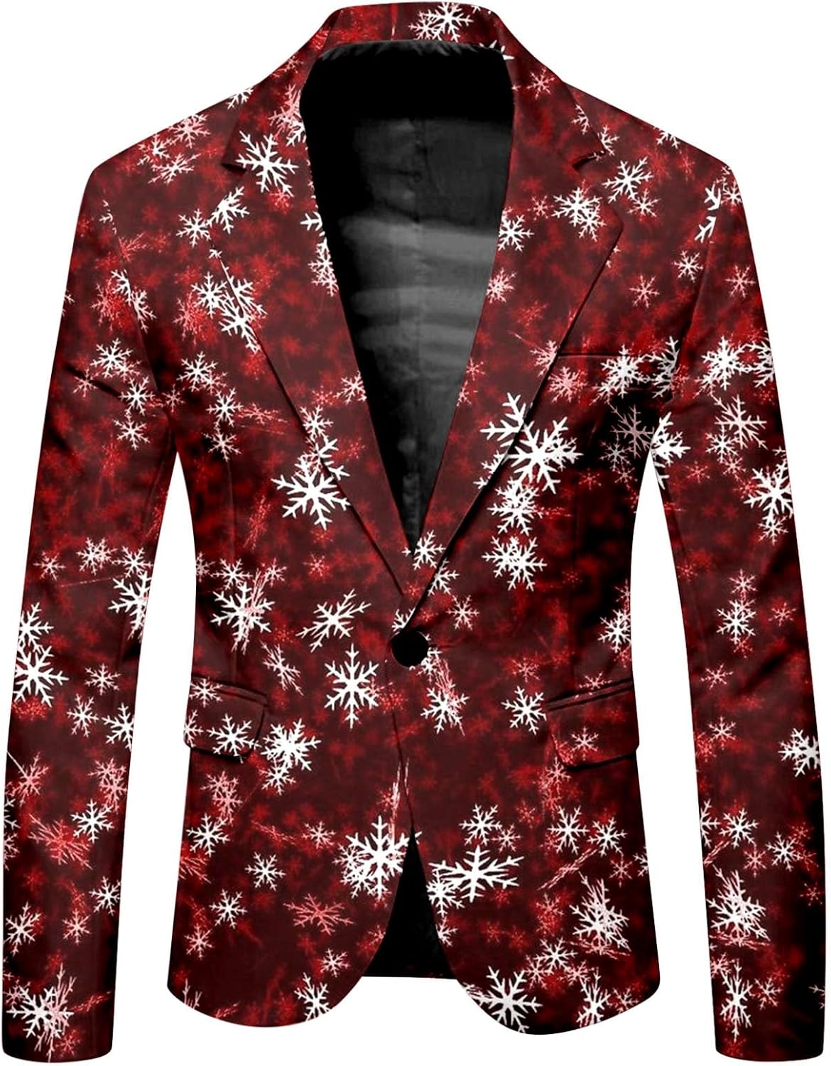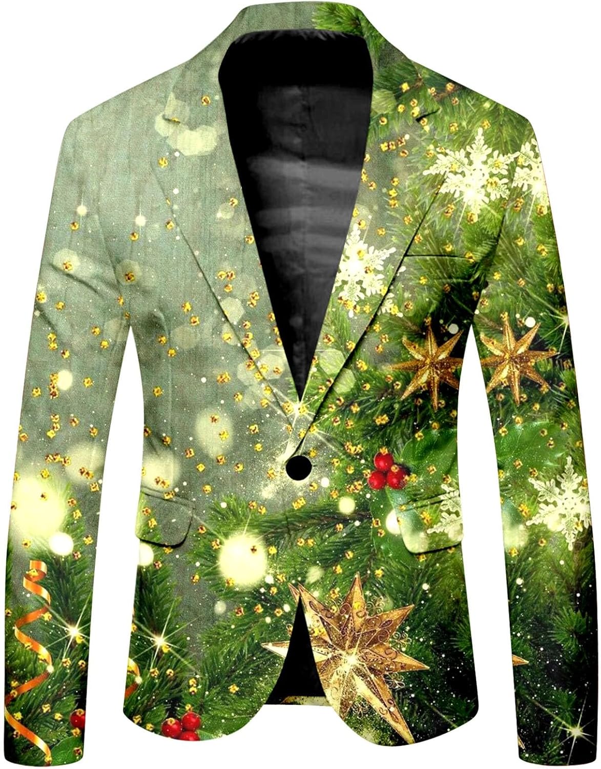 Bring festive cheer to your wardrobe with this men's Christmas blazer, a perfect mix of holiday spirit and classic tailoring. Made from soft, skin-friendly, and wrinkle-free polyester, this ugly Christmas suit jacket ensures breathable comfort and durability for long wear. The 3D print design, lapel collar, one-button closure, side split hem, shoulder pads, and flap pockets create a timeless yet eye-catching silhouette. Designed in a regular fit for easy layering, this Christmas suit jacket is ideal for a variety of occasions — from Christmas parties, New Year events, and holiday celebrations to business gatherings or casual outings. The vibrant colors and detailed festive graphics make this holiday blazer a standout choice. Style it with trousers or jeans to complete your Christmas party outfit and enjoy a cheerful, fashionable look all season long.